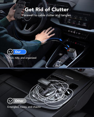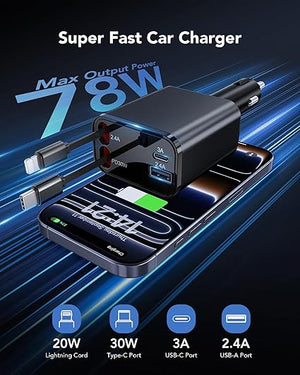 The 2026 Updated 78W Retractable Car Charger is a powerful, all-in-one charging solution designed for modern vehicles and fast-charging smartphones. Featuring two built-in 2.6 ft retractable cables along with USB-C and USB-A ports, this compact charging block allows you to charge up to four devices simultaneously without cable clutter. Engineered for speed, safety, and convenience, it is the perfect companion for daily commutes, road trips, and family travel.
