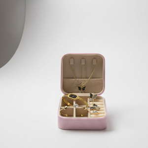 The collection is housed in a compact, high-quality pink vegan leather travel case, making it an ideal gift for birthdays, anniversaries, or bridesmaids. The interior features specialized compartments to keep your jewelry organized and tangle-free while on the go.